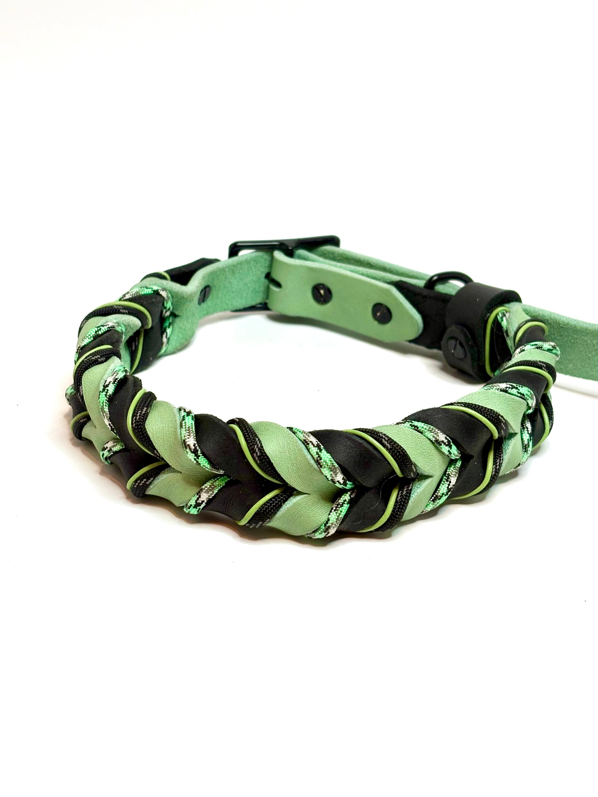 Das Halsband Fresh Mint vereint modernes Design mit robuster Funktionalität. Die harmonische Kombination aus sanftem Mintgrün und tiefem Schwarz wird durch fein eingearbeitete, geflochtene Details ergänzt und macht dieses Halsband zu einem echten Blickfang.