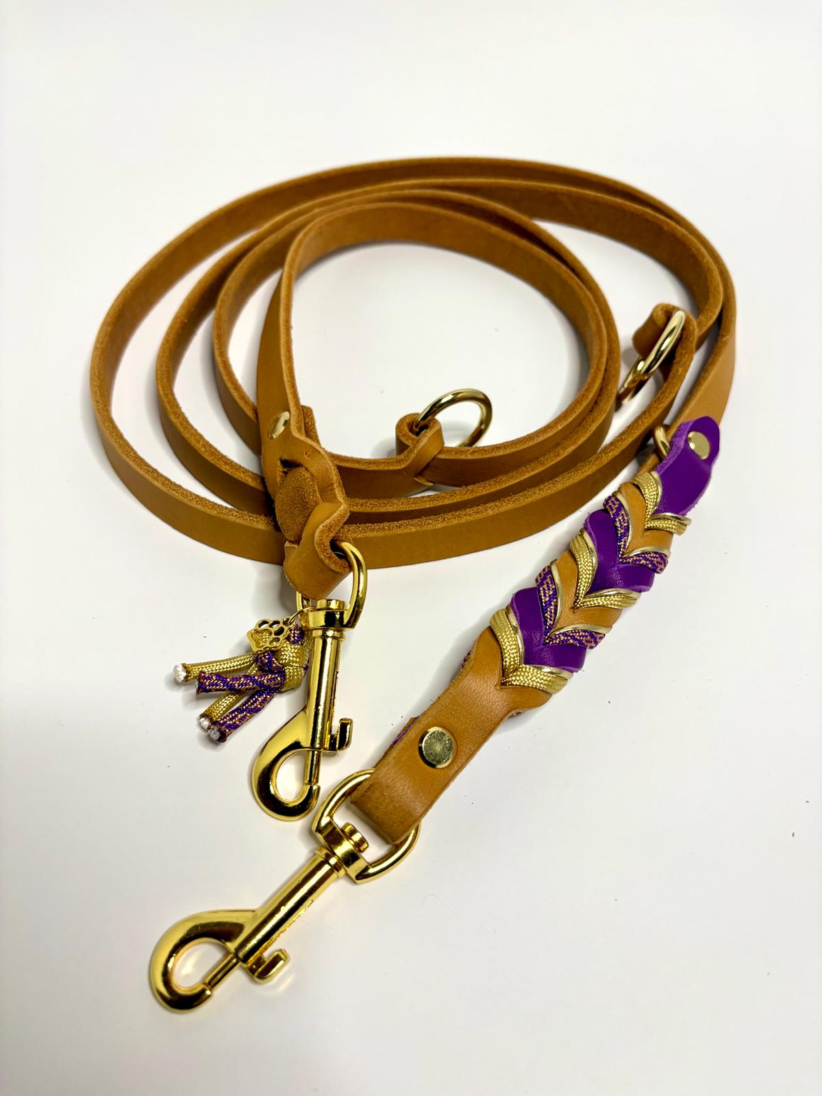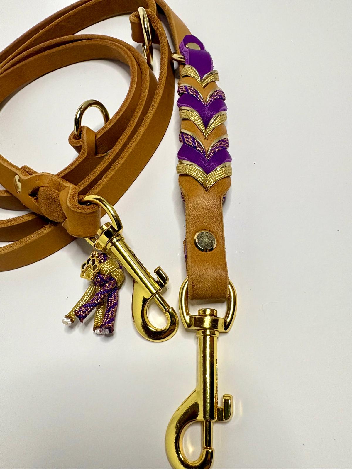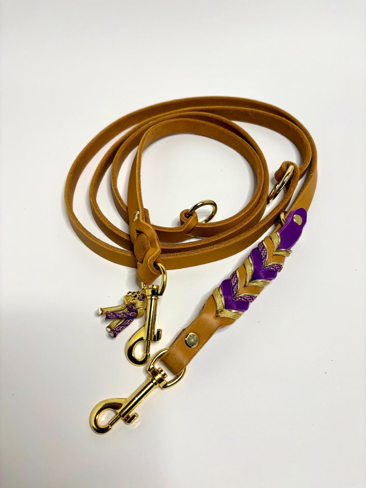 Die Leine Finn 2.0 kombiniert edles Fettleder in warmem Naturton mit kunstvollen Flechtdetails in kräftigem Violett und goldenen Akzenten. Ein eleganter Blickfang für stilbewusste Hundehalter.