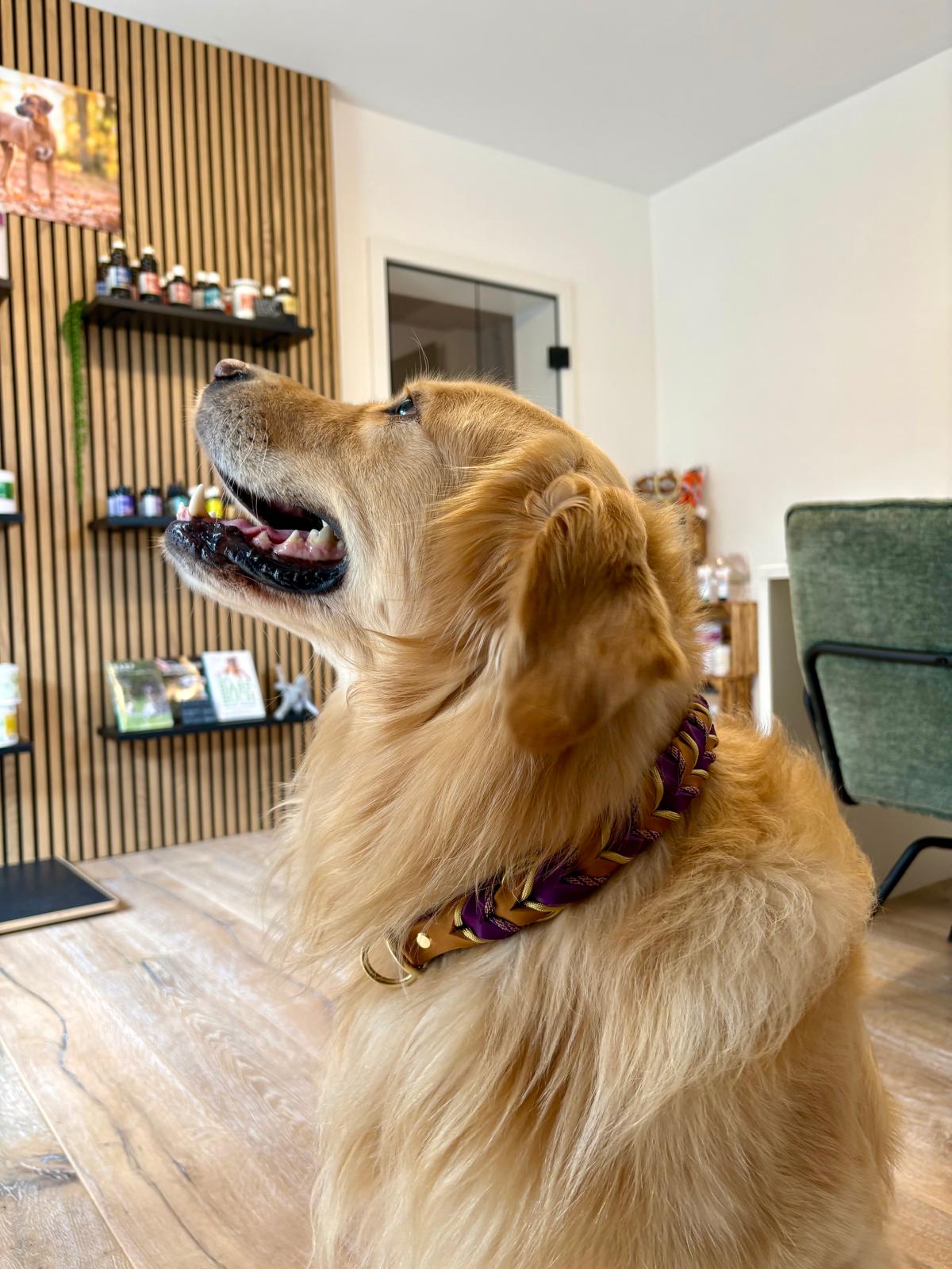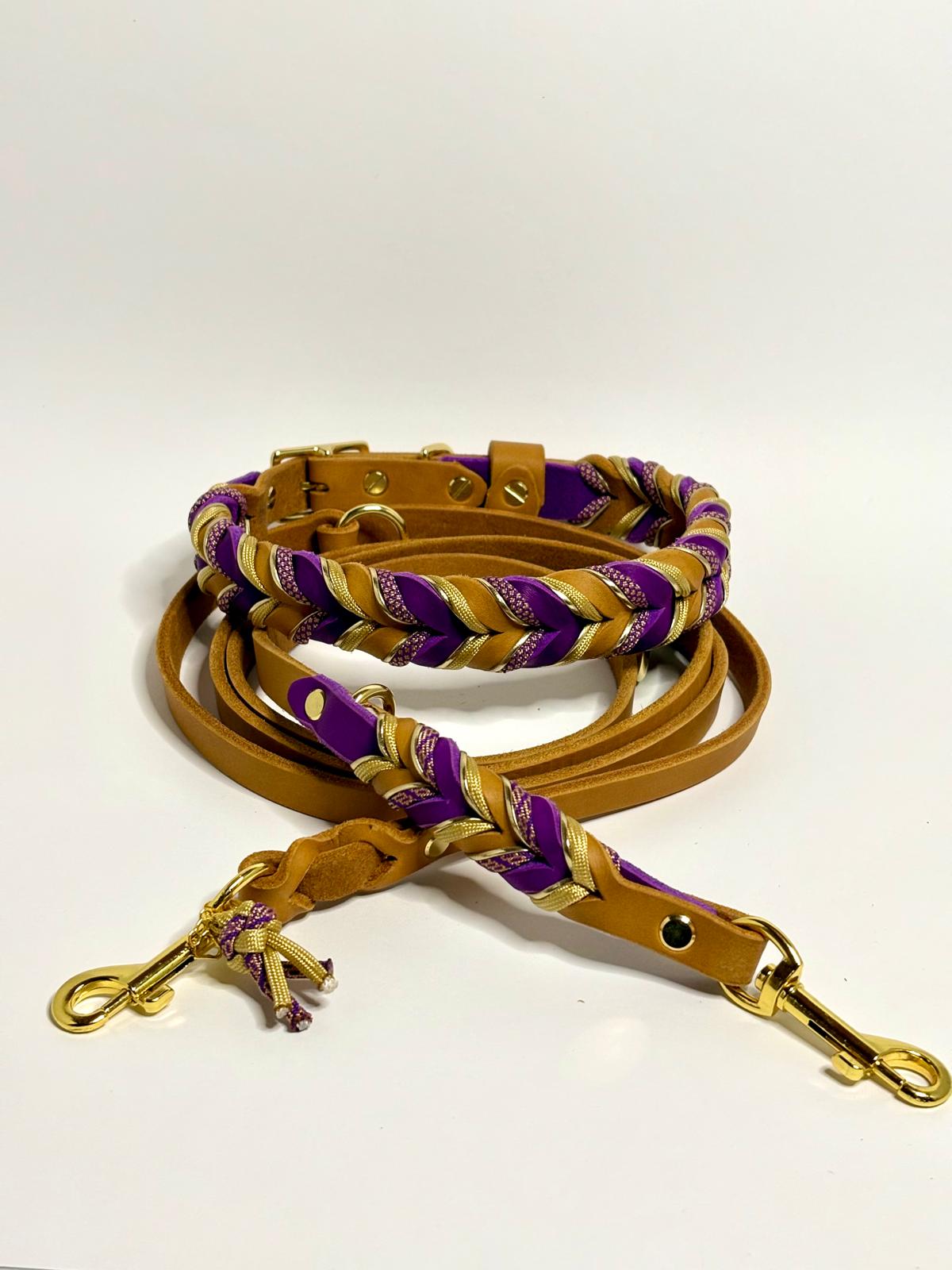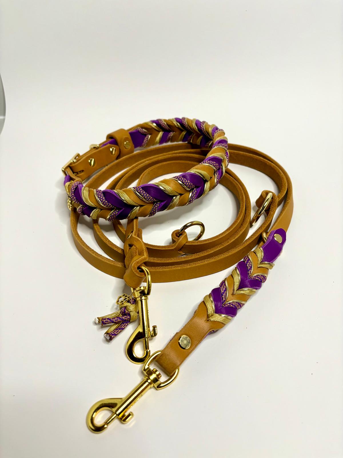 Die Leine Finn 2.0 kombiniert edles Fettleder in warmem Naturton mit kunstvollen Flechtdetails in kräftigem Violett und goldenen Akzenten. Ein eleganter Blickfang für stilbewusste Hundehalter.